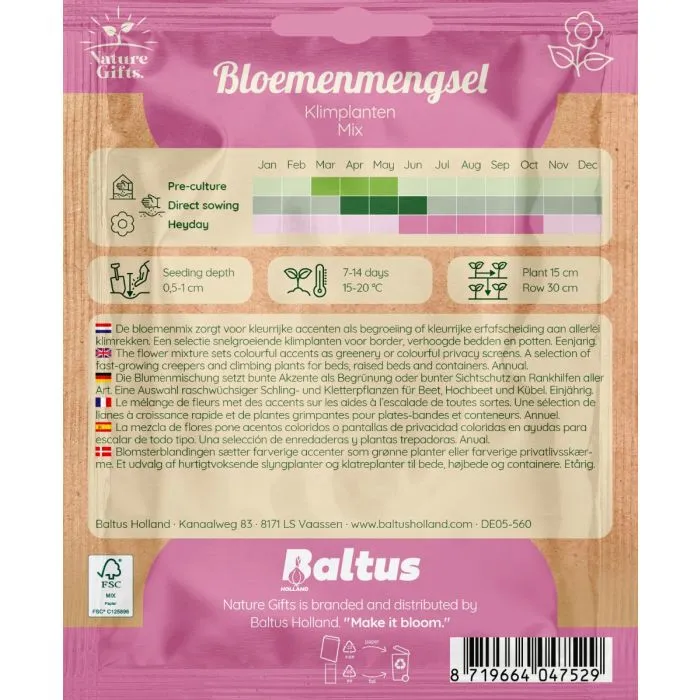Dit bloemenmengsel voor klimplanten is de ideale oplossing om schuttingen of muren om te toveren tot een verticale gekleurde bloemenzee. Zaaitijd: maart - juni. Bloeitijd: juni - oktober.