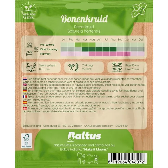 Bonen kruidig peperkruid. Onmisbaar aromatisch kruid voor in de keuken. Krachtige, pittige smaak die doet denken aan een combinatie van tijm en peper. Zaaitijd: maart - augustus. Bloeitijd: mei - oktober.