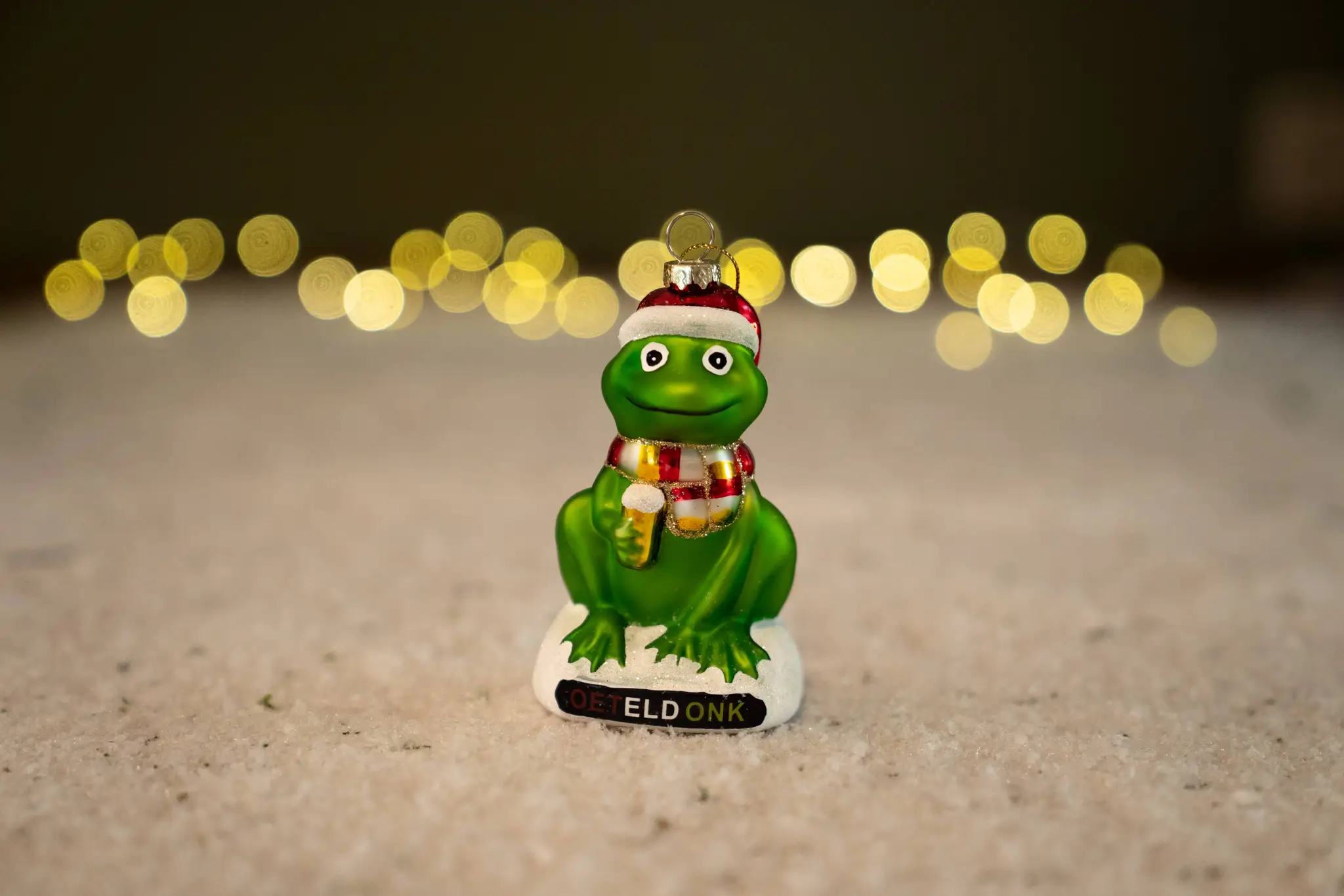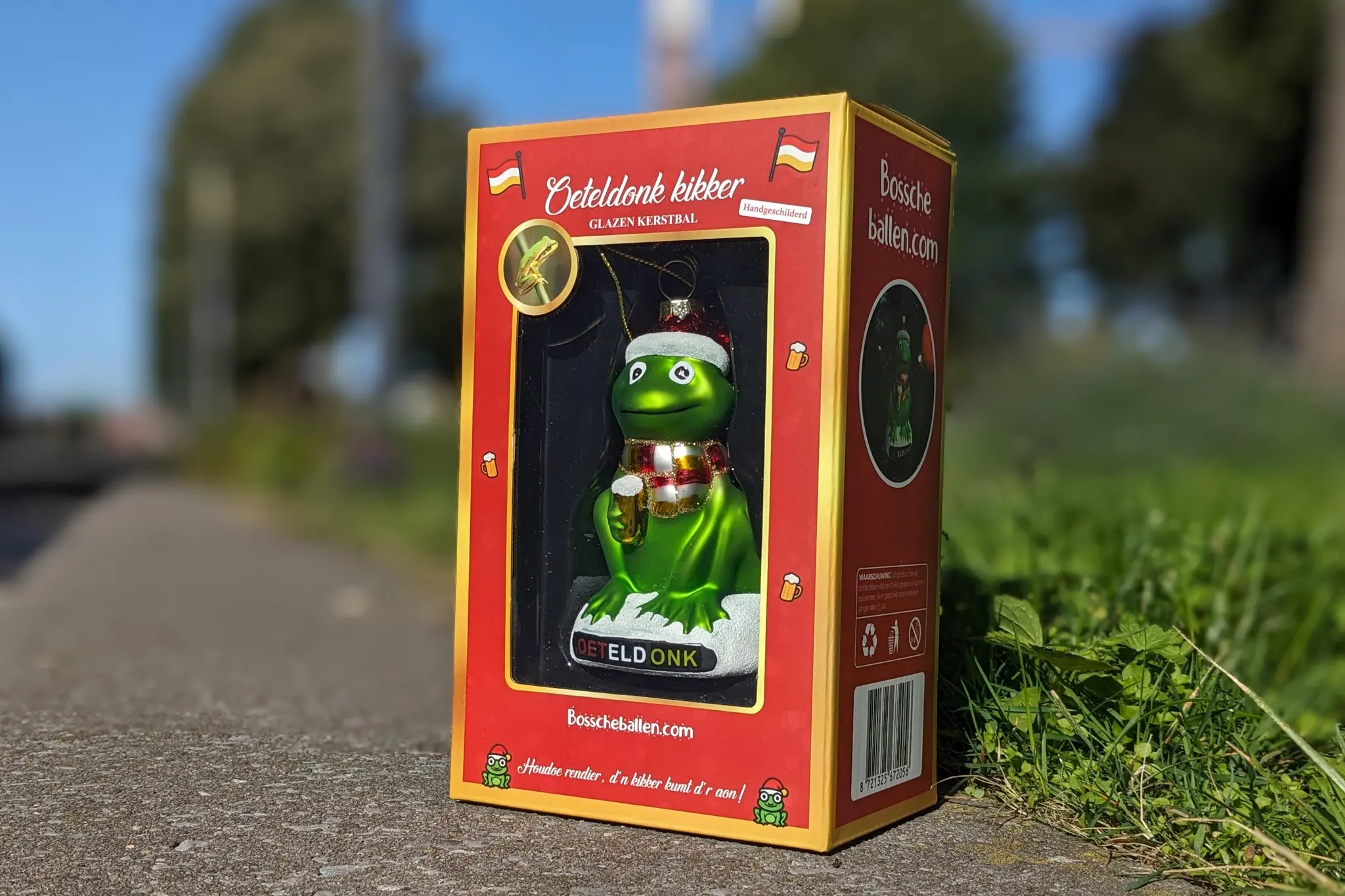 Deze kikker straalt één en al Oeteldonk uit. Hij zit trots op zijn sokkel met de naam “Oeteldonk” in vrolijke kleuren, heeft een rood-wit-gele sjaal stevig om zijn nek geknoopt en een kerstmuts die hem perfect in de feeststemming zet. Alsof dat nog niet genoeg is, houdt hij ook nog een goudkleurig biertje vast – hét symbool van Bossche gezelligheid. De kikker kijkt je met grote ogen guitig aan: een subtiel stukje humor in je kerstdecoratie.
