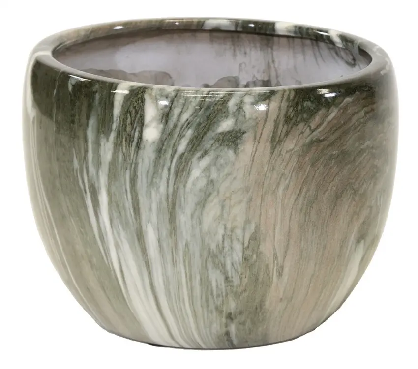 Groene keramische buikpot Emperor met marmerlook en glanzende finish, een stijlvolle plantenpot die perfect past bij middelgrote kamerplanten binnenshuis.