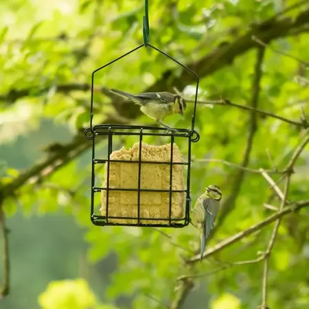 De vetblokhouder is gemaakt van duurzaam, gepoedercoat metaal in een elegante zwarte kleur, wat de levensduur van het product verlengt. Hang de houder op een rustige plek in je tuin en geniet van de vogels die erop afkomen.
