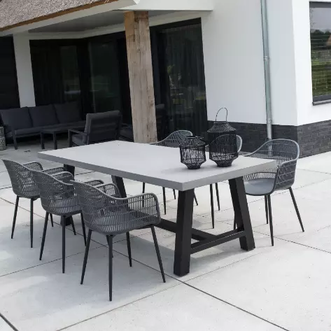 Het tafelblad is gemaakt van polystone, een innovatief materiaal dat de esthetiek van beton perfect nabootst. Polystone, een combinatie van cement en kunststofvezels, biedt de robuuste uitstraling van beton zonder het zware gewicht en de kwetsbaarheid ervan. Dit zorgt voor een stevige, duurzame tafel die bestand is tegen verschillende weersomstandigheden en jarenlang meegaat.