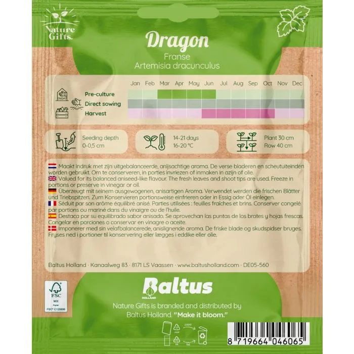 Dragon is de absolute koning onder de keukenkruiden, vooral bekend uit de klassieke Franse keuken. In tegenstelling tot de Russische variant, die vaak wat bitterder en minder verfijnd is, staat de Franse dragon bekend om zijn heerlijke, zachte anijsachtige smaak. Zaaitijd: maart - juni. Bloeitijd: juni - oktober.