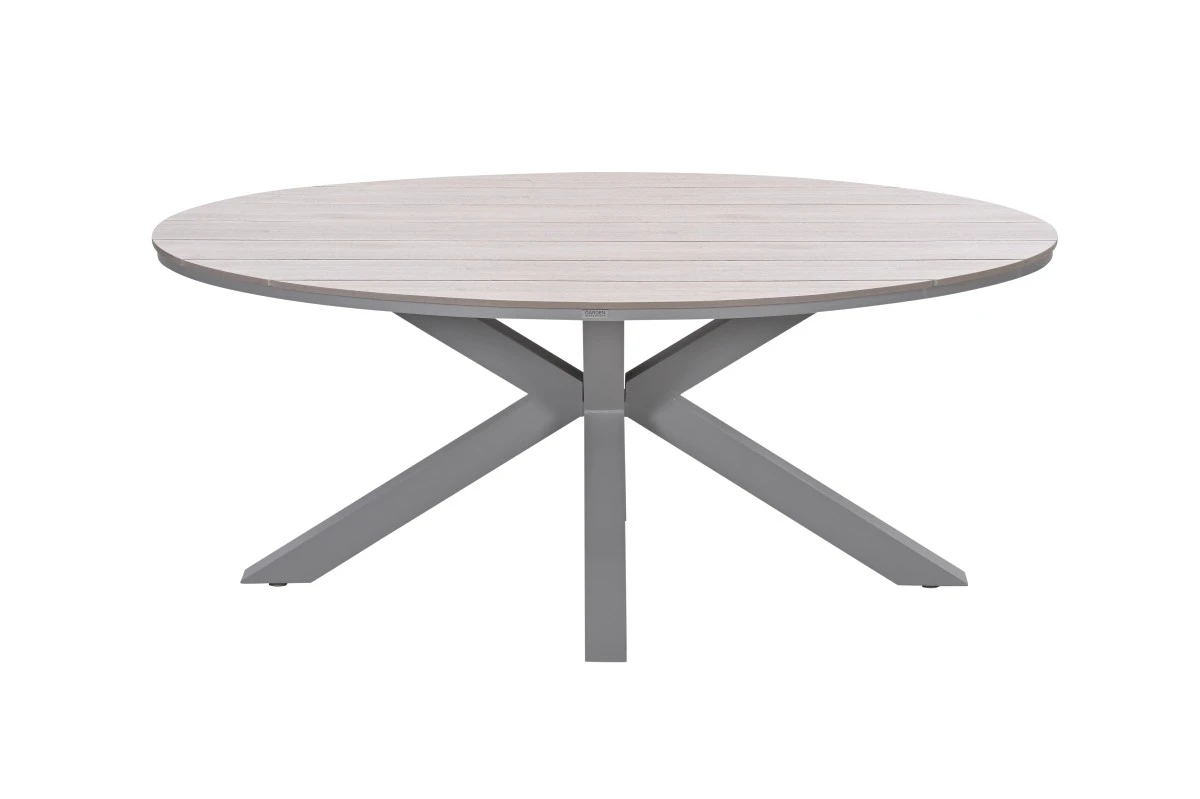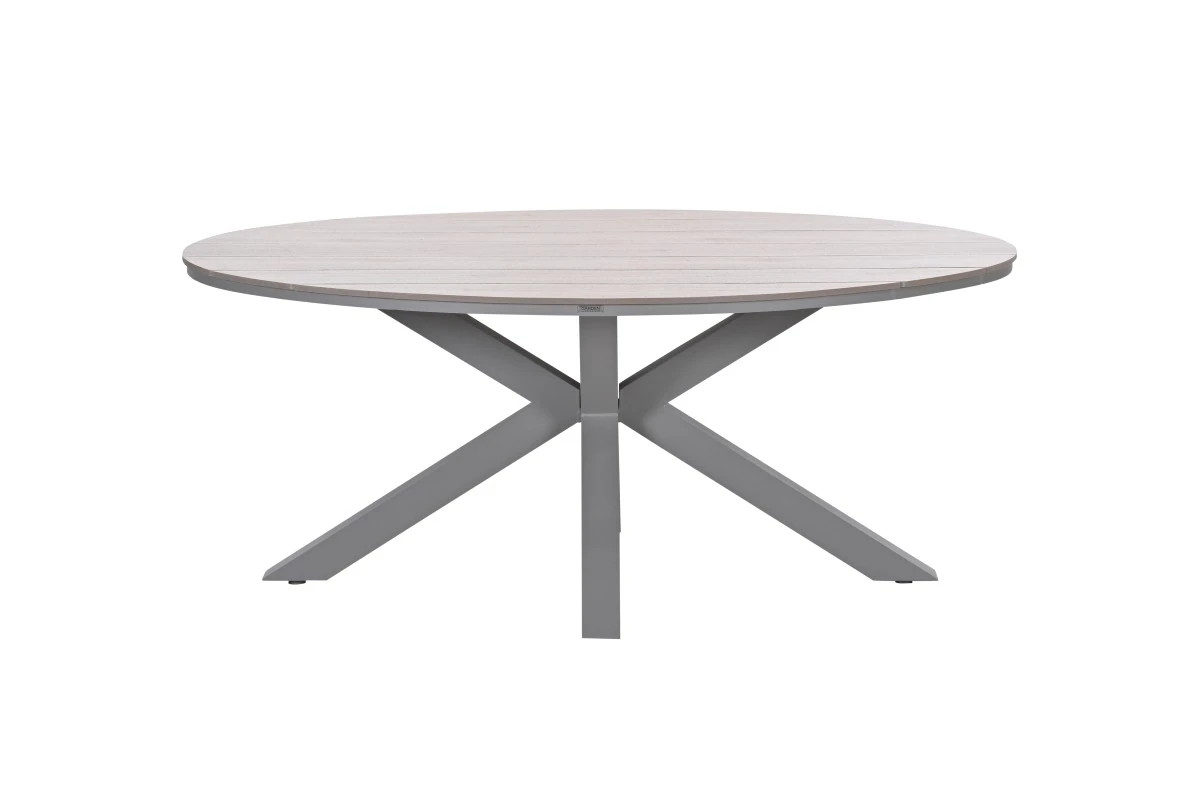 Deze ovale eettafel combineert tijdloos design met duurzame materialen. Dankzij de lichte houtlook, onderhoudsvriendelijke eigenschappen en elegante vormgeving creëer je moeiteloos een sfeervolle plek voor buiten dineren.