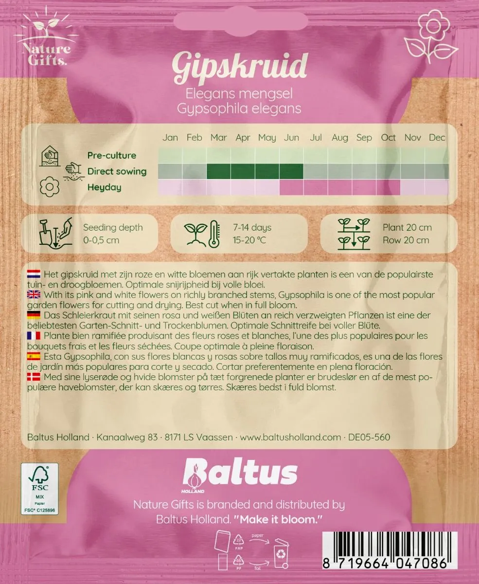 Dit mengsel van rijk vertakte planten met roze en witte bloempjes is een van de meest geliefde keuzes voor in de tuin of als droogbloem. Voor het beste resultaat als snijbloem kun je de takjes het beste oogsten wanneer ze volledig in bloei staan. Zaaien tussen maart en juni. Bloeit tussen juni en oktober.