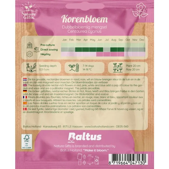 Dit dubbelbloemige korenbloemmengsel is een echte magneet voor insecten, met eetbare bloemblaadjes die perfect zijn als kleurrijke garnering. Je zaait ze tussen maart en juni voor een prachtige, volle bloei van juni tot augustus.