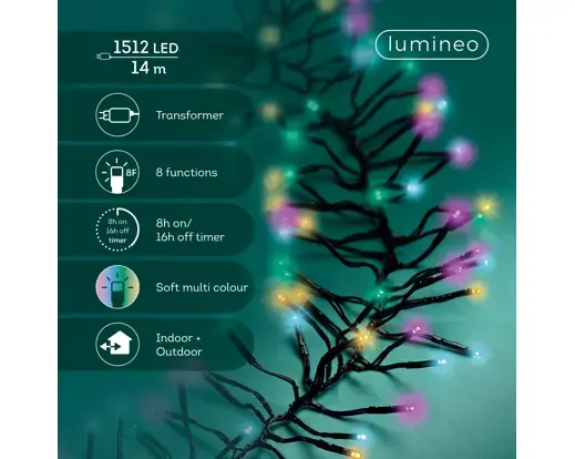 Breng een magische en feestelijke sfeer in je huis met de Lumineo Cluster Verlichting. Dit lichtsnoer is 14 meter lang en bevat maar liefst 1512 LED-lampjes, die in clusters dicht op elkaar zijn geplaatst. Deze opstelling zorgt ervoor dat jouw kerstboom of decoratie rijkelijk gevuld is met licht, wat een indrukwekkende uitstraling geeft.