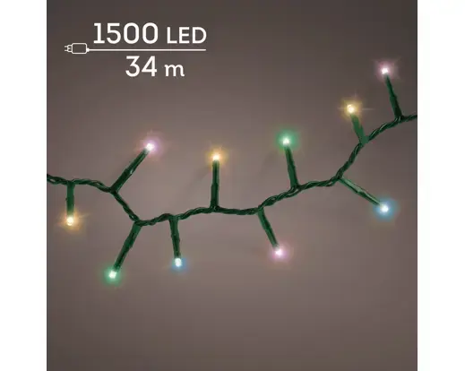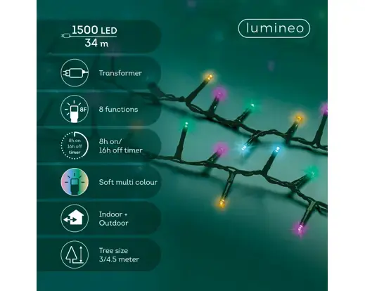 Met een snoer van 34 meter lang en lampjes in een vrolijke soft multi-kleur, is dit lichtsnoer ideaal voor het verfraaien van kerstbomen, guirlandes, kransen of andere objecten. Het groene snoer valt niet op en houdt de focus op de stralende lampjes. De verlichting is eenvoudig aan te sluiten met een stekker en biedt een timerfunctie, een twinkle-effect en 8 verschillende lichtfuncties om jouw decoraties te laten schitteren.