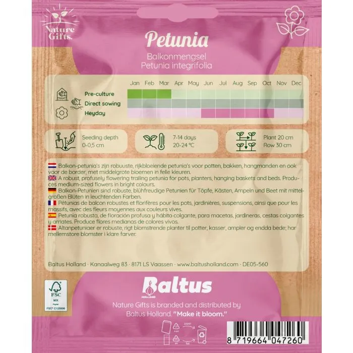 Petunia balkonmengsel. Speciaal mengsel voor potten en bakken. Vrolijke bloemen in verschillende kleurrijke tinten. Planten tussen januari en maart. Bloeit tussen juni en oktober.