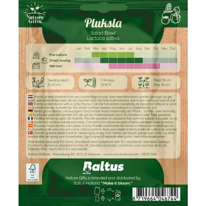 De Pluksla salad bowl is een sla met een nootachtige smaak. Kan meerdere keren worden geoogst als geplukt, gesneden of een keer als sla.