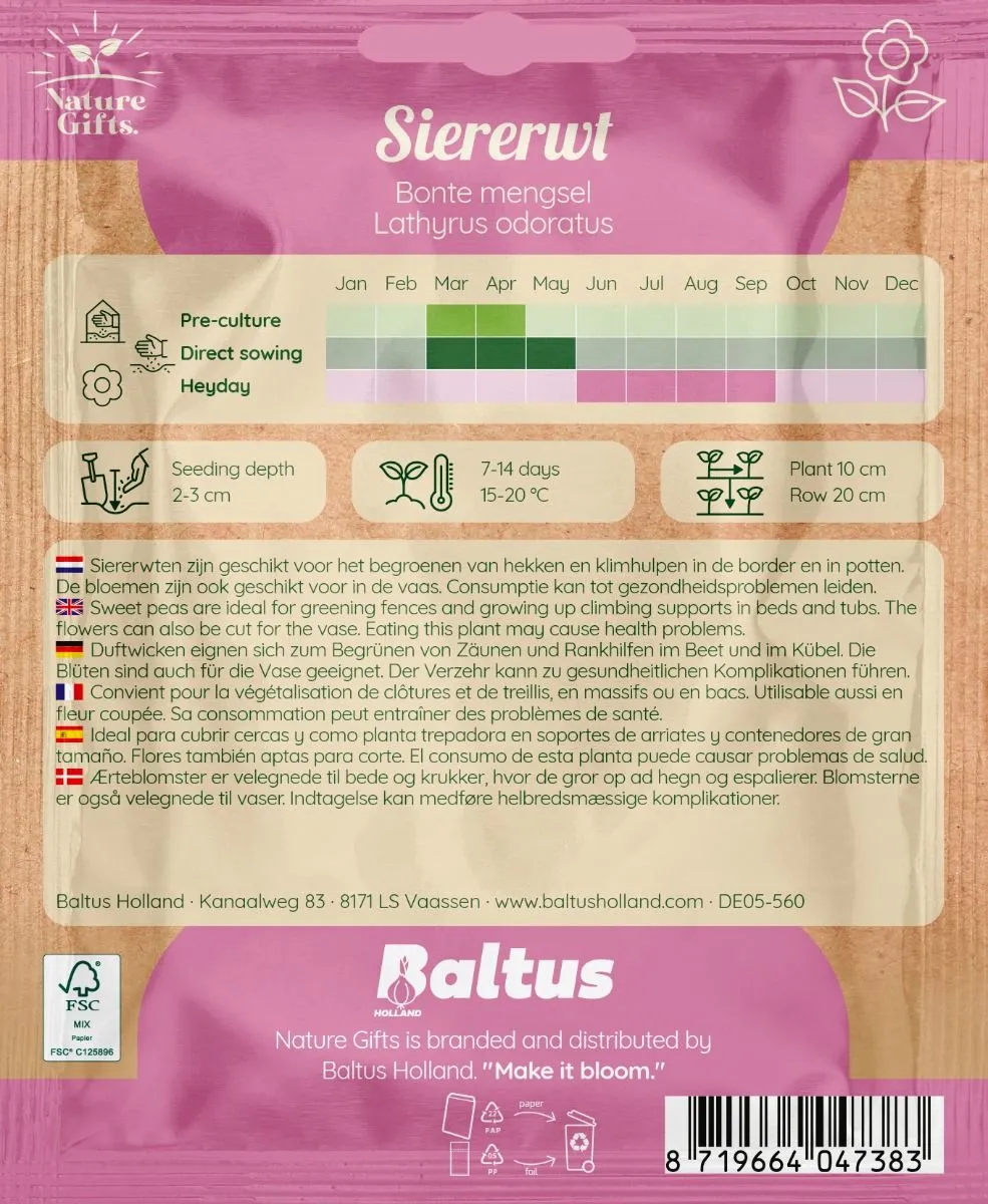 Siererwten zijn geschikt voor het begroenen van hekken en klimhulpen in de border in in potten. De bloemen zijn ook geschikt voor in de vaas. Bloeit tussen juni en september.
