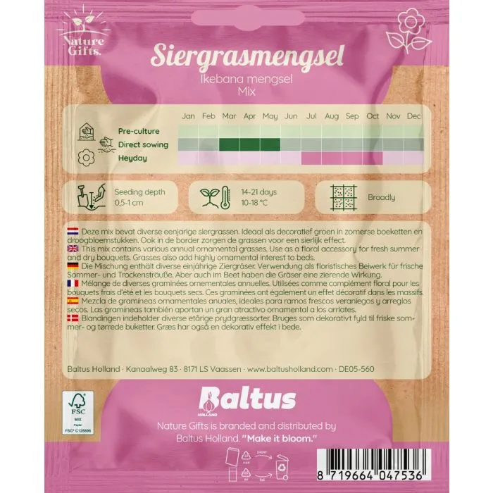 Het siergrasmengsel zorgt voor een natuurlijke uitstraling en geeft beweging en rust aan je tuin. Gemengde kleuren. Zaaitijd: maart - mei. Bloeitijd: juli - oktober.