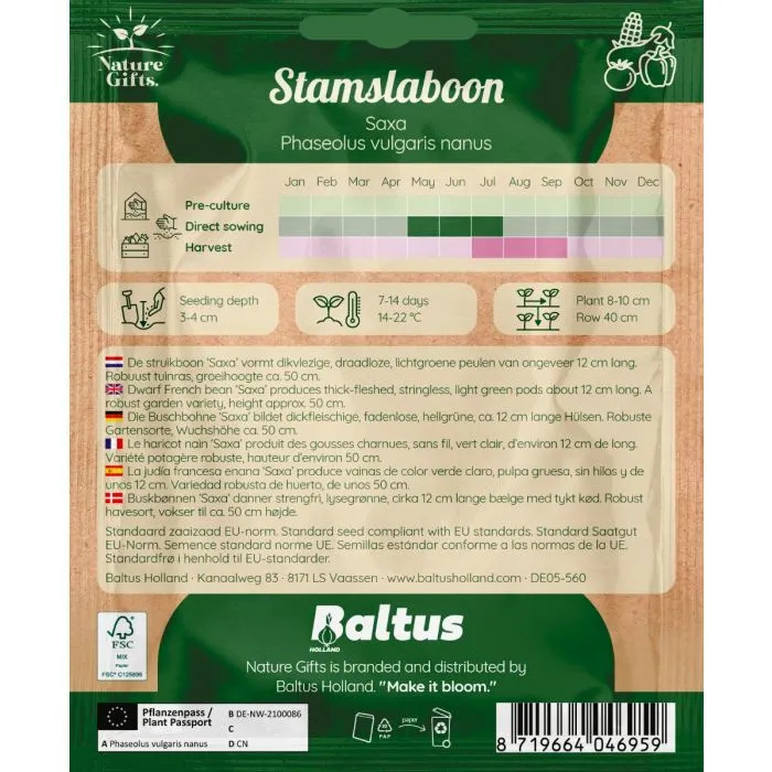 De stamslaboon Saxa is een rijkbloeiende plant met dikvlezige, draadloze, lichtgroene peulen van ongeveer 12 cm lang. Groeihoogte ca. 50cm.