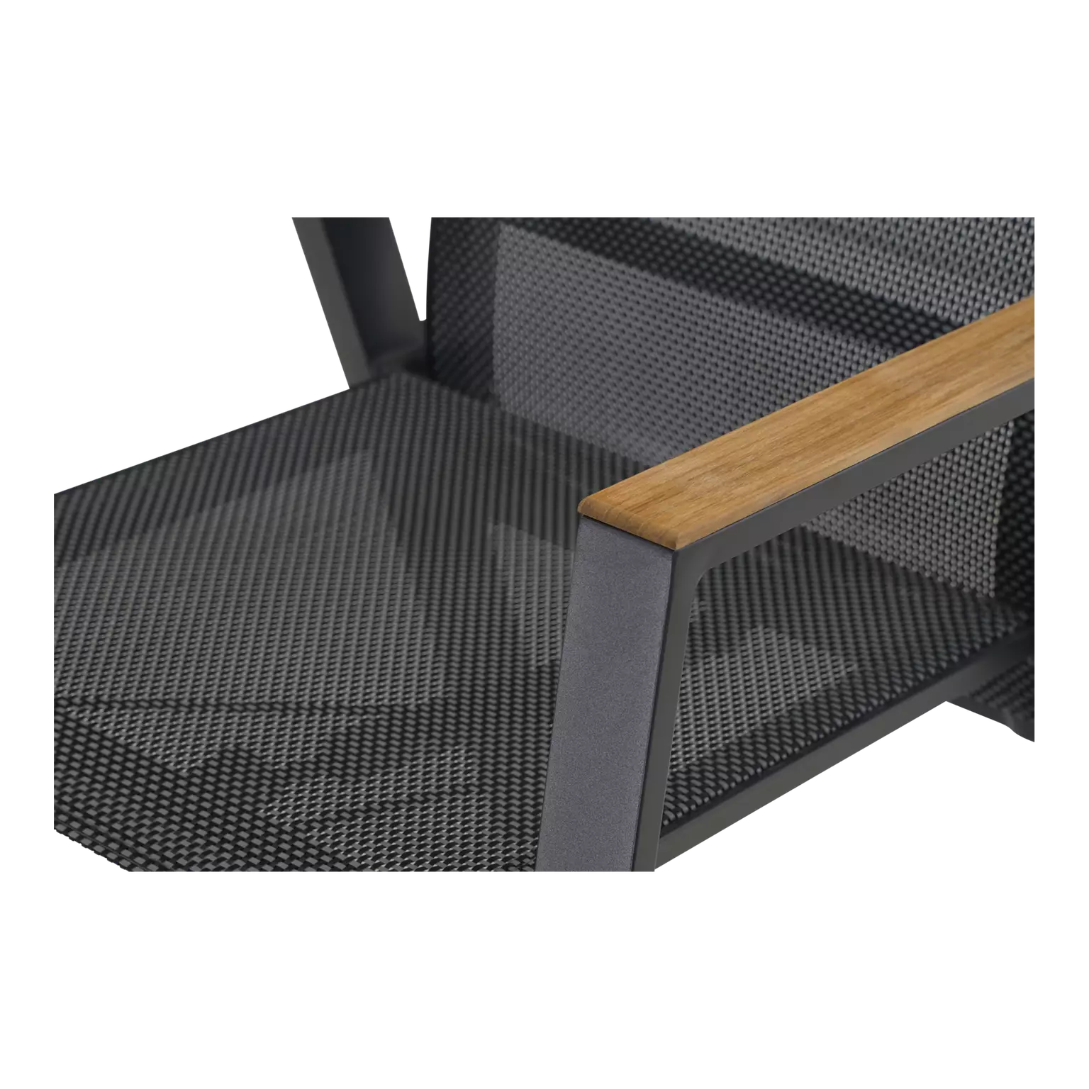 De armleuningen van de Amir Teak Negro zijn vervaardigd uit hoogwaardig teak, een duurzaam en weerbestendig houtsoort. Teak staat bekend om zijn lange levensduur en luxe uitstraling, wat deze stoel een verfijnde en elegante touch geeft.