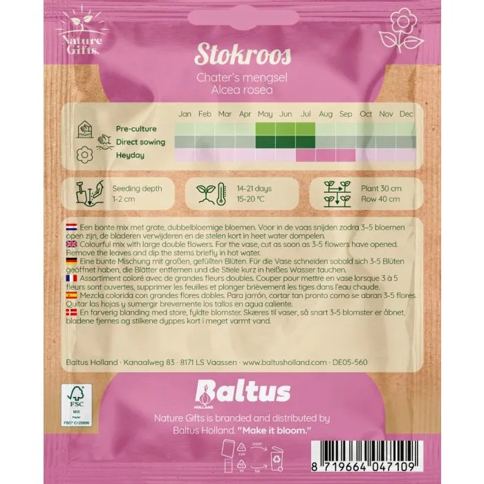 Stokroos Chaters, een bonte mix met grote, klassieke bloemen met hoge stelen. Deze bloem is ook aantrekkelijk voor bijen en vlinders. Planten tussen maart en juli. Bloeit tussen juli en september.