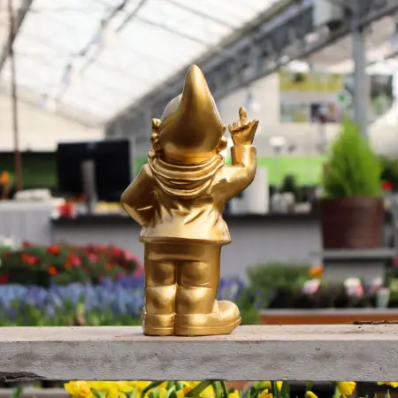 Deze kabouter combineert brutaliteit met een vleugje elegantie. In plaats van een standaard rode of groene kleur is hij uitgevoerd in een chique, glanzende gouden tint. Dit geeft hem een moderne en luxueuze uitstraling, waardoor hij niet alleen een grappige toevoeging aan je tuin is, maar ook een stijlvol decorstuk. Hij past perfect in elke tuin.