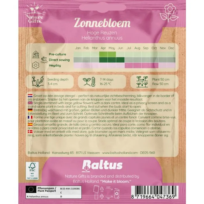 Zonnebloem hoge reuzen. Enorm grote bloem met hoge stelen, ideaal als achtergrond plant. Zaaien tussen april en juni. Bloeit tussen juni en oktober.